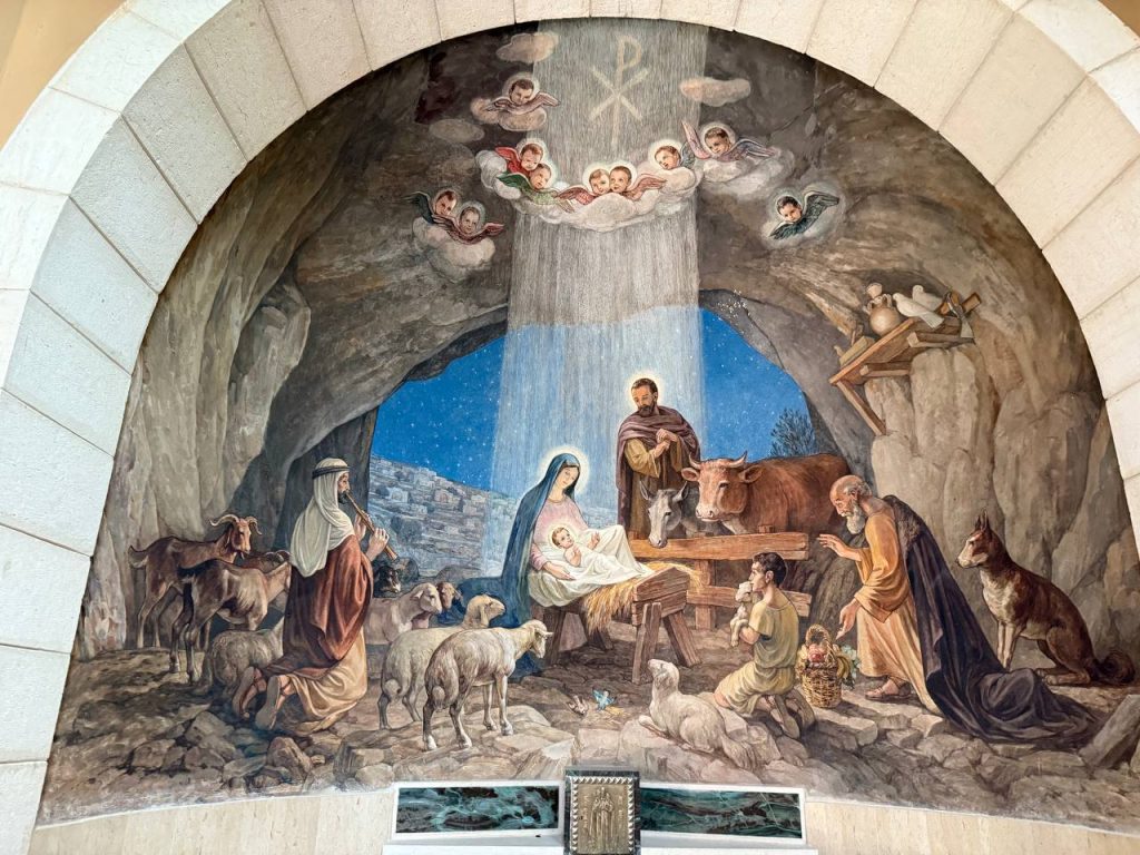 After the olive wood factory, we went to a Basilica where, in the basement, they have what they claim is the cave where Jesus was born. It is a basilica that three denominations claim — the Armenians, the Greek Orthodox, and the Roman Catholics.  In the Armenian section there were beautiful mosaics on the wall with gold on it. Each denomination has their own auditorium so to speak, so it is a very large building. Also the cave that Jerome translated the Vulgate Bible in, is in this huge expanse of a church. It was something very rare—the keeper of the key unlocked the cave and allowed us to go down into the cave so we could see it.
