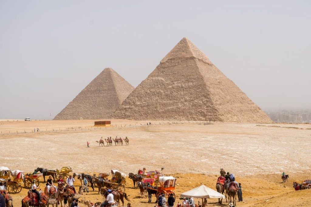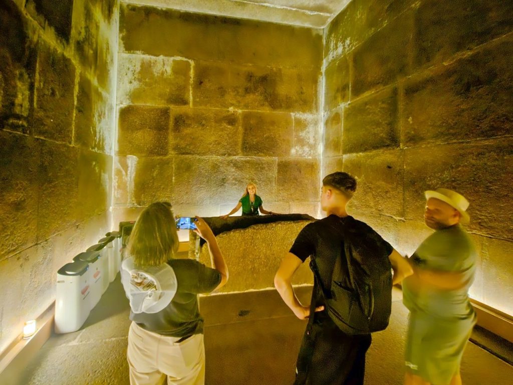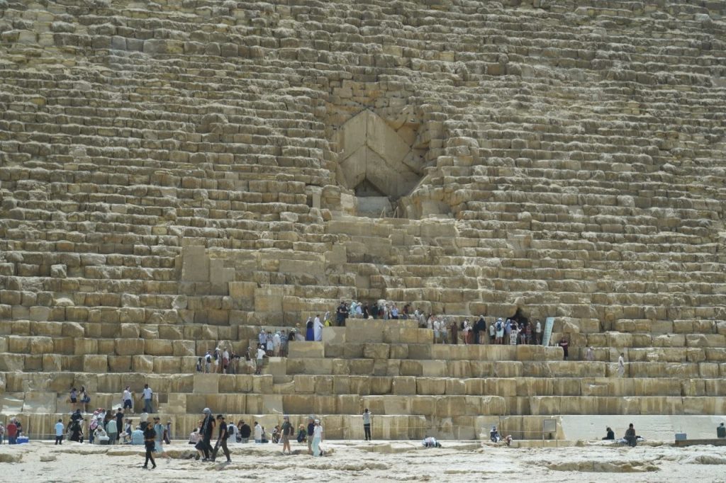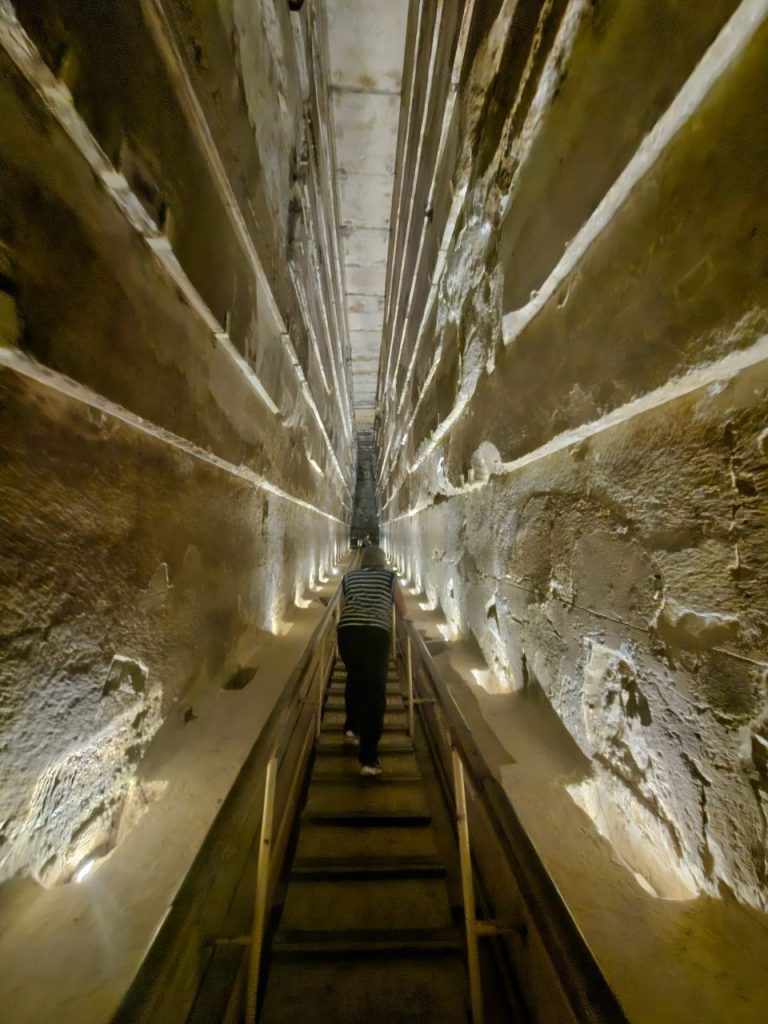 Entering the Great Pyramid of Giza, tomb of Pharaoh Khufu.